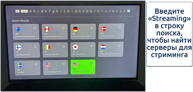 У PIA самая большая сеть серверов среди всех протестированных VPN, включая 53 серверные локации. Вы легко найдете ближайший сервер для лучших скоростей при стриминге с Apple TV. Это особенно полезно во время крупных спортивных событий, таких как «Супербоул» и «Мартовское безумие», когда серверы могут быть перегружены. PIA также предлагает серверы, оптимизированные для стриминга, в отдельных странах, таких как США, Великобритания и Япония.